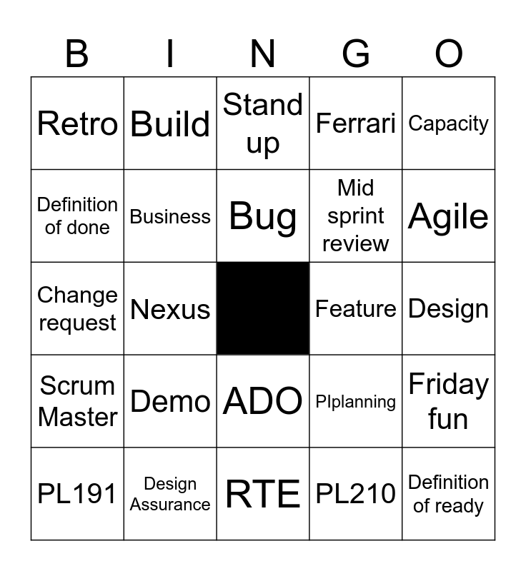 This bingo card has a free space and 29 words: PL191, PBI, Nexus, Product Owner, Retro, Stand up, Business, Demo, Feature, Design Assurance, Design, Definition of ready, RTE, PL210, Agile, Sprint, ADO, Scrum Master, Capacity, Change request, PIplanning, Test, Mid sprint review, Definition of done, Ferrari, Build, Friday fun, Bug and Task.