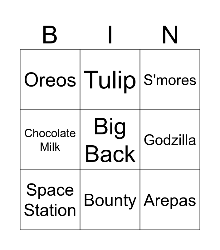 This bingo card has a free space and 8 words: Godzilla, S'mores, Tulip, Space Station, Oreos, Arepas, Chocolate Milk and Bounty.