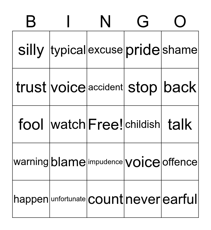 This bingo card has a free space and 24 words: blame, unfortunate, accident, happen, shame, silly, trust, typical, childish, impudence, stop, fool, voice, offence, voice, never, talk, excuse, back, watch, earful, warning, pride and count.