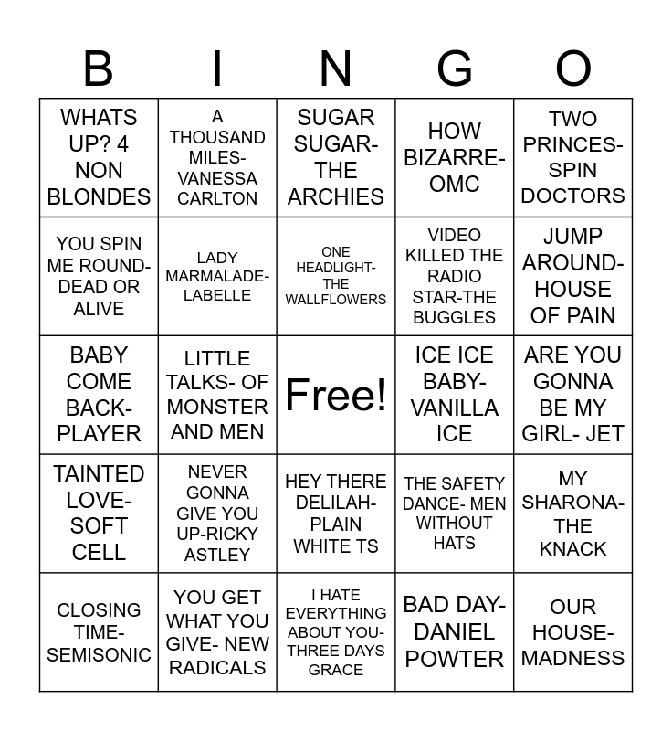 This bingo card has a free space and 70 words: RETURN OF THE MACK- MARK MORRISON, ARE YOU GONNA BE MY GIRL- JET, SPIRIT IN THE SKY- NORMAN, WALKING IN MEMPHIS- MARC COHN, YOU GET WHAT YOU GIVE- NEW RADICALS, BREAKFAST AT TIFFANYS- DEEP BLUE SOMETHING, HOW BIZARRE- OMC, STACEYS MOM- FOUNTAINS OF WAYNE, TWO PRINCES- SPIN DOCTORS, TUBTHUMPING- CHUMBAWAMABA, MY SHARONA- THE KNACK, B!TCH- MERIDITH BROOKS, WHATS UP? 4 NON BLONDES, SUGAR SUGAR- THE ARCHIES, TEENAGE DIRTBAG- WEEZER, LITTLE TALKS- OF MONSTER AND MEN, HEY THERE DELILAH- PLAIN WHITE TS, VIDEO KILLED THE RADIO STAR-THE BUGGLES, KUNG FU FIGHTING- CARL DOUGLAS, TAINTED LOVE- SOFT CELL, ICE ICE BABY- VANILLA ICE, THE SAFETY DANCE- MEN WITHOUT HATS, JUMP AROUND- HOUSE OF PAIN, 99 LUFTBALLONS- NENA, COTTON EYE JOE- REDNEX, MAMBO NO 5-LOU BEGA, BEST DAY OF MY LIFE- AMERICAN AUTHORS, BUTTERFLY-CRAZY TOWN, BAD DAY- DANIEL POWTER, SHAKE IT- METRO STATION, A THOUSAND MILES- VANESSA CARLTON, I LOVE IT- ICONA POP, TOO CLOSE- ALEX CLARE, LET HER GO- PASSENGER, JERK IT OUT- CAESARS, BETTE DAVIS EYES- KIM CARNES, FUNKYTOWN- LIPPS, SUNGLASSES AT NIGHT- COREY HART, LETS HEAR IT FOR THE BOYS- DENIECE WILLIAMS, YOU SPIN ME ROUND- DEAD OR ALIVE, I RAN- A FLOCK OF SEAGULLS, NEVER GONNA GIVE YOU UP-RICKY ASTLEY, OUR HOUSE- MADNESS, EYE OF THE TIGER- SURVIVOR, WAR- EDWIN STARR, LADY MARMALADE- LABELLE, CLOSING TIME- SEMISONIC, KISS ME- SIXPENCE NON THE RICHER, NO RAIN- BLINE MELON, YOUR LOVE-THE OUTFIELD, ALL FOR YOU- SISTER HAZEL, MAGIC-PILOT, SHINE- COLLECTIVE SOUL, TOMS DINER- SUZANNE VEGA, I HATE EVERYTHING ABOUT YOU- THREE DAYS GRACE, GLORIA- LAURA BRANIGAN, ONE HEADLIGHT- THE WALLFLOWERS, TRULY MADLY DEEPLY- SAVAGE GARDEN, BLINDED BY THE LIGHT- MANFRED MANN, RETURN OF INNOCENCE- ENIGMA, BABY COME BACK-PLAYER, THE WAY IT IS- BRUCE HORNSBY, MORE THAN A FEELING- BOSTON, ALL BY MYSELF- ERIC CARMEN, STILL THE ONE- ORLEANS, SUPER FREAK- RICK JAMES, HOLD ME NOW- THOMPSON TWINS, THAT THING YOU DO!- THE WONDERS, ALL MY LIFE- KCI JO JO and ACHY BREAKY HEART- BILLY RAY CYRUS.