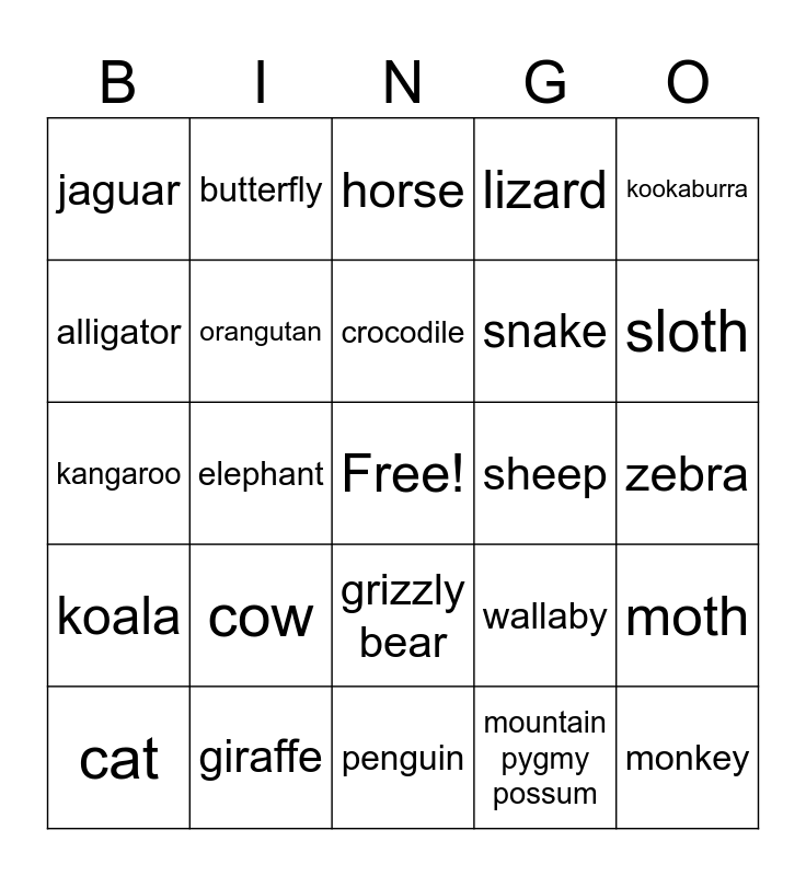 This bingo card has a free space and 29 words: cat, dog, elephant, lemur, jaguar, horse, orangutan, cow, sheep, giraffe, zebra, monkey, penguin, mountain pygmy possum, sloth, polar bear, grizzly bear, koala, kookaburra, kangaroo, wallaby, rainbow lorikeet, snake, alligator, lizard, butterfly, moth, crocodile and frog.