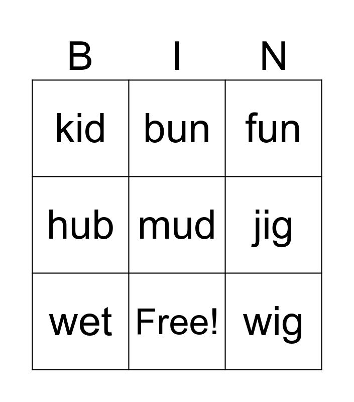 This bingo card has 10 words: Free!, fun, kid, mud, hub, wet, bun, lug, jig and wig.