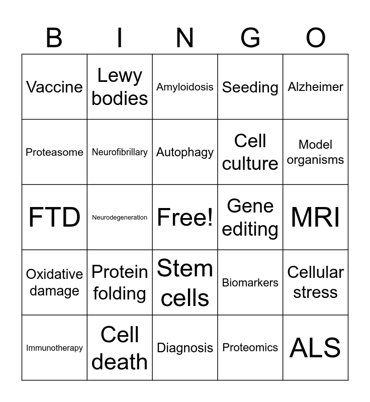 This bingo card has a free space and 75 words: Misfolding, Aggregation, Amyloidosis, Prions, Tau, Synuclein, Aβ, Oligomers, Fibrils, Chaperones, HSPs, Ubiquitin, Autophagy, Proteasome, Inclusions, Neurodegeneration, Huntington, ALS, Parkinson, Alzheimer, Creutzfeldt-Jakob, FTD, Neurofibrillary, Lewy bodies, Seeding, Toxicity, Neuroprotection, Genetics, Environment, Post-translational, Folding, Pathways, Disulfide, Biomarkers, Model organisms, Cell culture, Patient samples, PET imaging, MRI, Proteomics, Transcriptomics, Metabolomics, Systems biology, Drug discovery, Therapeutics, Antibodies, Immunotherapy, Vaccine, Animal models, CRISPR, RNAi, Stem cells, Tissue engineering, Precision medicine, Neuroimaging, Neuroinflammation, Neuropathology, Synaptic dysfunction, Cognitive impairment, Motor dysfunction, Protein folding, Aggresomes, Molecular dynamics, Structural biology, Small molecules, Gene editing, Biomolecular interactions, Protein structure, Protein quality, Cellular stress, Oxidative damage, Cell death, Pathogenesis, Diagnosis and PMCA.