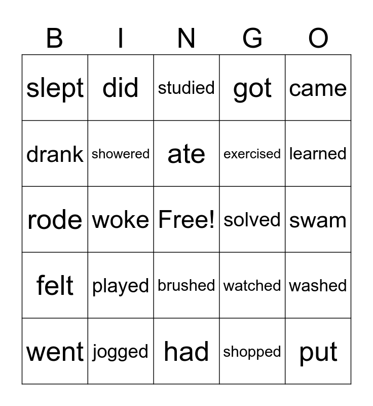 This bingo card has a free space and 24 words: played, jogged, ate, went, came, slept, drank, did, solved, brushed, exercised, rode, watched, washed, showered, shopped, swam, studied, learned, woke, put, felt, got and had.