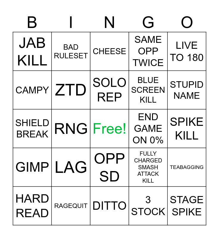 This bingo card has a free space and 24 words: LAG, RAGEQUIT, SOLO REP, HARD READ, LIVE TO 180, JAB KILL, CAMPY, BAD RULESET, END GAME ON 0%, OPP SD, BLUE SCREEN KILL, SHIELD BREAK, FULLY CHARGED SMASH ATTACK KILL, TEABAGGING, ZTD, 3 STOCK, SPIKE KILL, CHEESE, STUPID NAME, RNG, STAGE SPIKE, GIMP, SAME OPP TWICE and DITTO.