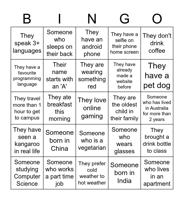 This bingo card has 25 words: Someone born in China, They prefer cold weather to hot weather, They are wearing something red, Someone studying Computer Science, They don't drink coffee, They speak 3+ languages, They have a favourite programming language, Someone who sleeps on their back, They are the oldest child in their family, Someone who is a vegetarian, They have already made a website before, They travel more than 1 hour to get to campus, Someone who wears glasses, They brought a drink bottle to class, Their name starts with an 'A', Someone who lives in an apartment, Someone who has lived in Australia for more than 2 years, They have an android phone, They have a pet dog, They ate breakfast this morning, They love online gaming, Someone who works a part time job, They have seen a kangaroo in real life, They have a selfie on their phone home screen and Someone born in India.