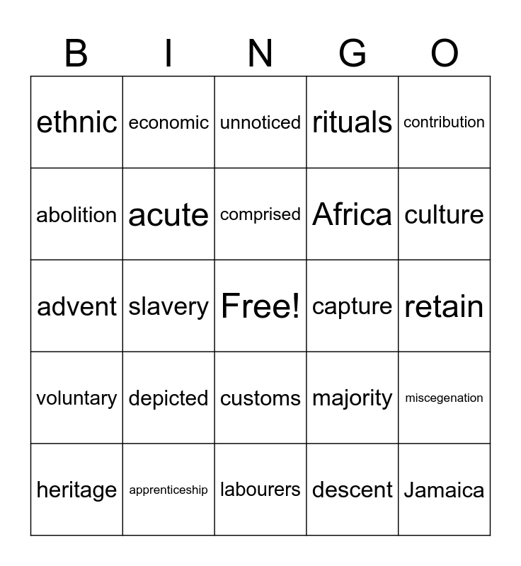 This bingo card has a free space and 24 words: heritage, depicted, comprised, descent, contribution, ethnic, economic, unnoticed, capture, retain, advent, acute, majority, miscegenation, abolition, apprenticeship, labourers, rituals, culture, voluntary, slavery, customs, Africa and Jamaica.