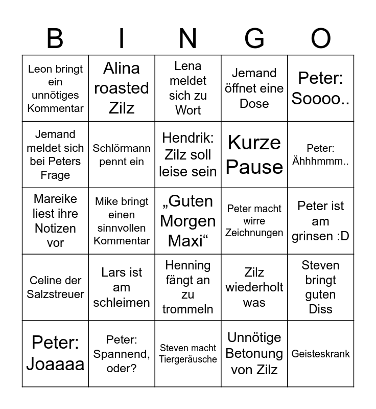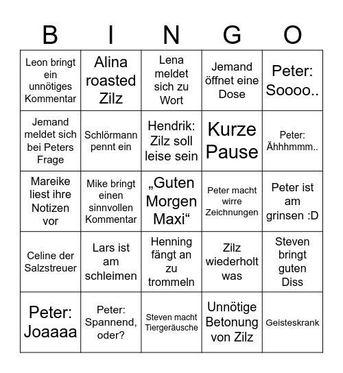 This bingo card has a free space and 24 words: Lars ist am schleimen, Peter: Spannend, oder?, Hendrik: Zilz soll leise sein, Peter: Joaaaa, Peter: Soooo.., Leon bringt ein unnötiges Kommentar, Jemand meldet sich bei Peters Frage, Alina roasted Zilz, Peter macht wirre Zeichnungen, Henning fängt an zu trommeln, Kurze Pause, Mareike liest ihre Notizen vor, Zilz wiederholt was, Steven bringt guten Diss, Schlörmann pennt ein, Unnötige Betonung von Zilz, Peter ist am grinsen :D, Lena meldet sich zu Wort, Peter: Ähhhmmm.., Mike bringt einen sinnvollen Kommentar, Geisteskrank, Celine der Salzstreuer, Jemand öffnet eine Dose and Steven macht Tiergeräusche.