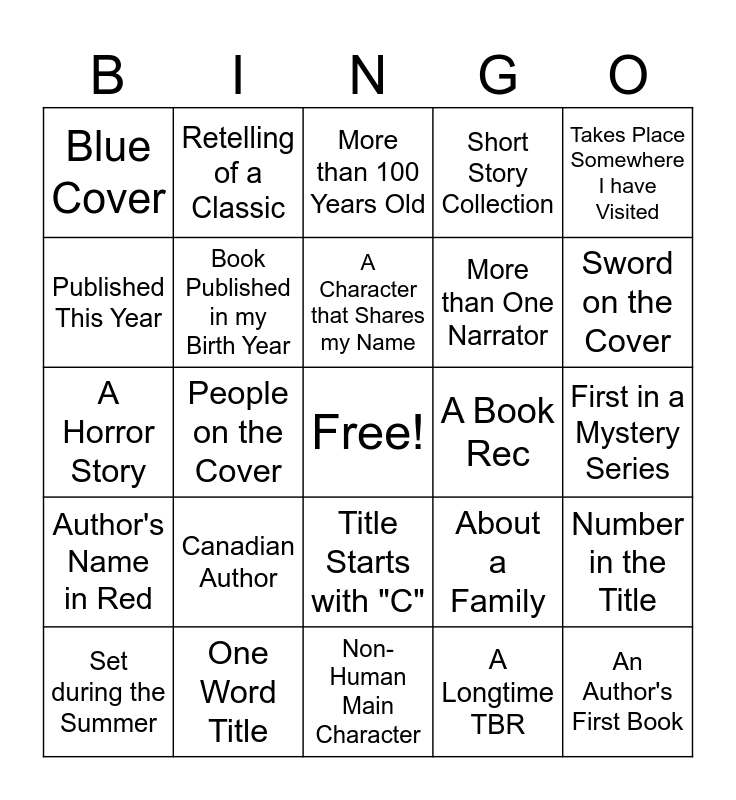 This bingo card has a free space and 24 words: Canadian Author, One Word Title, A Character that Shares my Name, Set during the Summer, Takes Place Somewhere I have Visited, Blue Cover, Published This Year, Retelling of a Classic, A Book Rec, Title Starts with "C", More than One Narrator, A Horror Story, About a Family, Number in the Title, Book Published in my Birth Year, A Longtime TBR, First in a Mystery Series, More than 100 Years Old, Sword on the Cover, People on the Cover, An Author's First Book, Author's Name in Red, Short Story Collection and Non-Human Main Character.