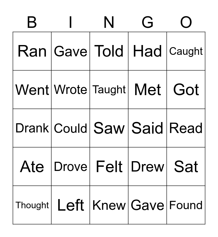 This bingo card has a free space and 29 words: Thought, Bought, Could, Was, Ran, Told, Wrote, Drove, Said, Left, Read, Found, Knew, Gave, Got, Forgot, Felt, Ate, Caught, Drank, Drew, Lay, Met, Went, Had, Gave, Sat, Taught and Took.