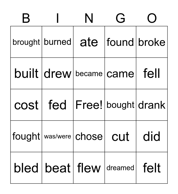 This bingo card has a free space and 24 words: was/were, beat, became, bled, broke, brought, built, burned, bought, chose, came, cost, cut, did, drew, dreamed, drank, ate, fell, fed, felt, fought, found and flew.