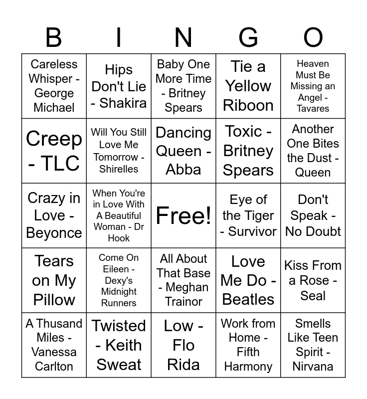 This bingo card has a free space and 36 words: Brown Eyed Girl - Van Morrison, I'm a Believer - The Monkees, Sherry - Frankie Valli, Will You Still Love Me Tomorrow - Shirelles, Love Me Do - Beatles, Tears on My Pillow, Dancing Queen - Abba, Annie's Song - John Denver, Heaven Must Be Missing an Angel - Tavares, Down Under - Men At Work, When You're in Love With A Beautiful Woman - Dr Hook, Tie a Yellow Riboon, Take On Me - Aha, Eye of the Tiger - Survivor, Another One Bites the Dust - Queen, Careless Whisper - George Michael, Karma Chameleon - Culture Club, Come On Eileen - Dexy's Midnight Runners, Smells Like Teen Spirit - Nirvana, Baby One More Time - Britney Spears, Don't Speak - No Doubt, Kiss From a Rose - Seal, Twisted - Keith Sweat, A Thusand Miles - Vanessa Carlton, Low - Flo Rida, Hips Don't Lie - Shakira, Crazy in Love - Beyonce, Hot N Cold - Katy Perry, Toxic - Britney Spears, Creep - TLC, Counting Stars - Onerepublic, Shake it Off - Taylor Swift, Work from Home - Fifth Harmony, All About That Base - Meghan Trainor, Diamonds - Rhanna and Radioactive - Imagine Dragons.