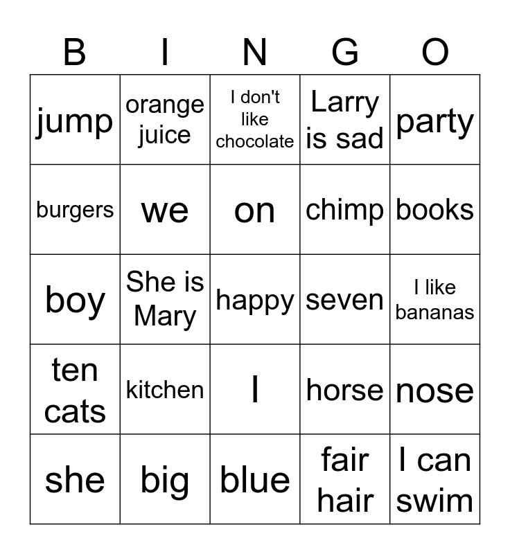 This bingo card has 25 words: kitchen, blue, on, she, party, jump, burgers, orange juice, seven, I, chimp, boy, horse, nose, we, I can swim, I like bananas, I don't like chocolate, books, She is Mary, happy, big, ten cats, Larry is sad and fair hair.