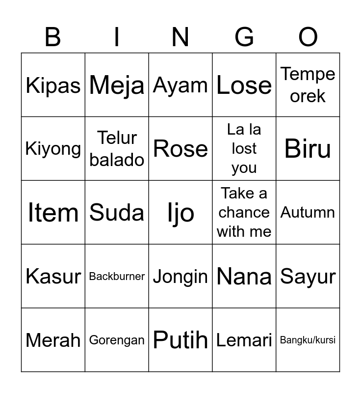 This bingo card has 25 words: Backburner, Putih, Rose, Merah, Tempe orek, Kipas, Kiyong, Meja, Take a chance with me, Jongin, La la lost you, Item, Nana, Sayur, Telur balado, Bangku/kursi, Autumn, Ayam, Biru, Suda, Ijo, Gorengan, Kasur, Lose and Lemari.