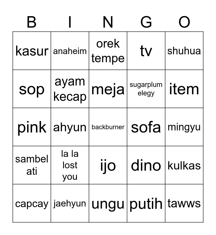 This bingo card has a free space and 24 words: la la lost you, jaehyun, meja, capcay, shuhua, kasur, sop, anaheim, sofa, ijo, sugarplum elegy, pink, dino, kulkas, ayam kecap, putih, mingyu, orek tempe, item, ahyun, tawws, sambel ati, tv and ungu.