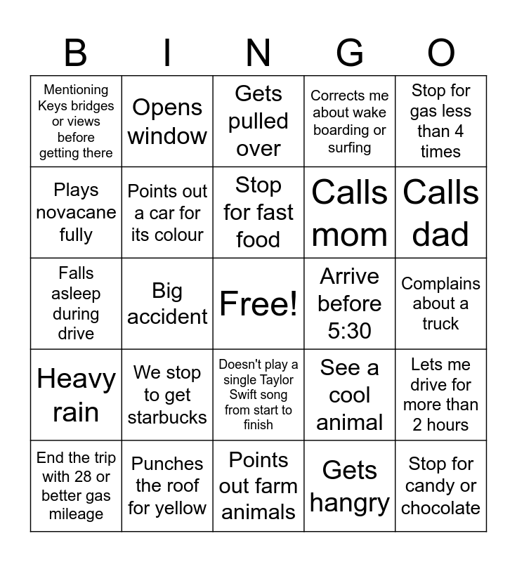 This bingo card has a free space and 24 words: We stop to get starbucks, Punches the roof for yellow, Stop for fast food, End the trip with 28 or better gas mileage, Stop for gas less than 4 times, Mentioning Keys bridges or views before getting there, Plays novacane fully, Opens window, Arrive before 5:30, Doesn't play a single Taylor Swift song from start to finish, Calls mom, Falls asleep during drive, See a cool animal, Lets me drive for more than 2 hours, Points out a car for its colour, Gets hangry, Complains about a truck, Gets pulled over, Calls dad, Big accident, Stop for candy or chocolate, Heavy rain, Corrects me about wake boarding or surfing and Points out farm animals.