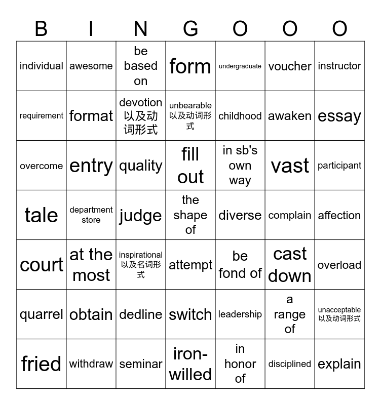 This bingo card has 59 words: catch sb's attention, tale, submit以及名词形式, entry, judge, a range of, instructor, staff, format, unacceptable以及动词形式, form, dedline, voucher, inspirational以及名词形式, in honor of, individual, awaken, undergraduate, postgraduate, requirement, essay, be based on, participant, vast, improvement, attempt, court, firm, devotion以及动词形式, cast down, shape, obtain, iron-willed, disciplined, awesome, diverse, switch, childhood, be fond of, unbearable以及动词形式, leadership, quality, overcome, nervousness以及形容词形式, affection, fried, withdraw, seminar, fill out, department store, explain, quarrel, complain, at the most, overload, in sb's own way, bake, the shape of and educate.