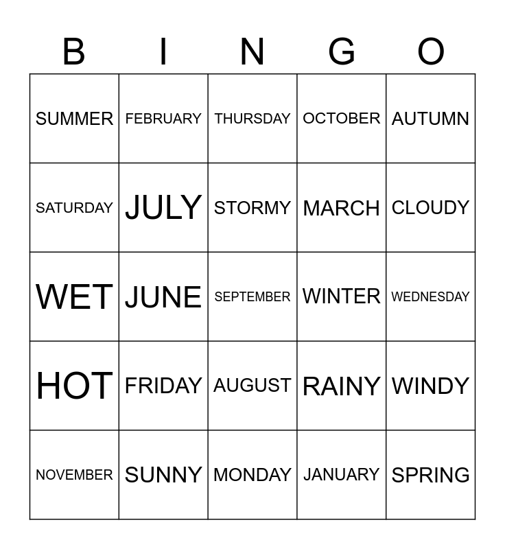 This bingo card has 30 words: SUNNY, MAY, JUNE, SUNDAY, SUMMER, THURSDAY, JULY, AUGUST, WINTER, MONDAY, WEDNESDAY, SEPTEMBER, JANUARY, SPRING, CLOUDY, TUESDAY, RAINY, HOT, FRIDAY, AUTUMN, WET, COLD, FEBRUARY, MARCH, SATURDAY, OCTOBER, WINDY, NOVEMBER, STORMY and DECEMBER.