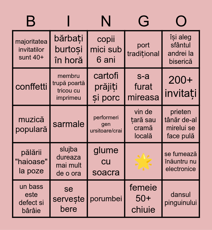 This bingo card has 25 words: slujba dureaza mai mult de o ora, porumbei, cartofi prăjiți și porc, un bass este defect si bârâie, își aleg sfântul andrei la biserică, majoritatea invitatilor sunt 40+, conffetti, bărbați burtoși în horă, vin de țară sau cramă locală, glume cu soacra, s-a furat mireasa, muzică populară, 🌟, se fumează înăuntru nu electronice, membru trupă poartă tricou cu imprimeu, dansul pinguinului, prieten tânăr de-al mirelui se face pulă, copii mici sub 6 ani, 200+ invitați, sarmale, performeri gen ursitoare/crai, se servește bere, pălării "haioase" la poze, port tradițional and femeie 50+ chiuie.