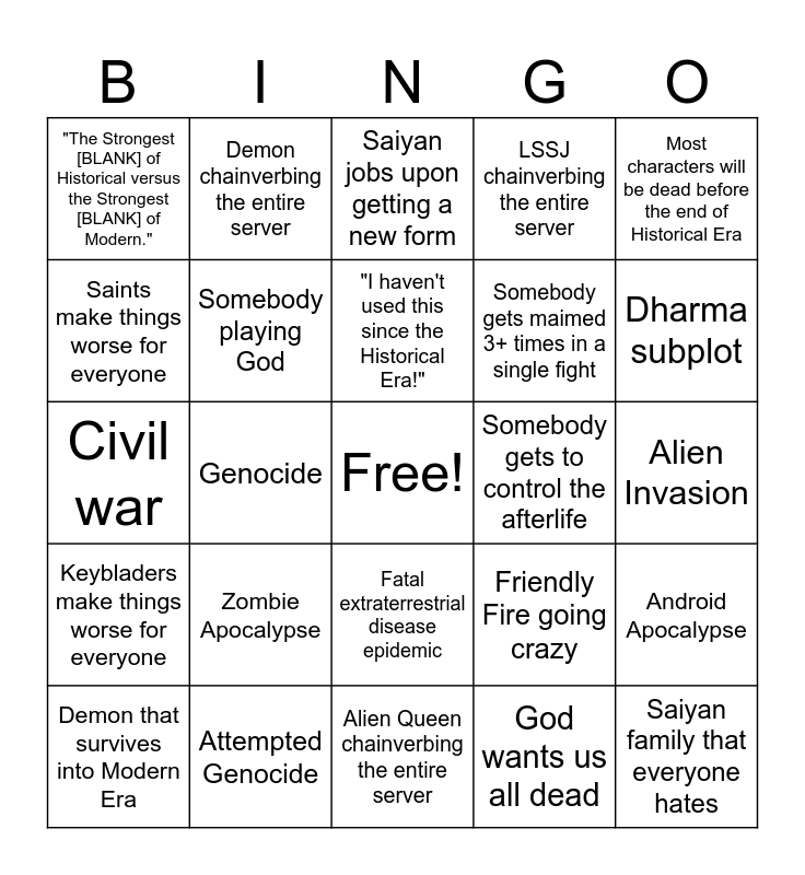 This bingo card has a free space and 24 words: Zombie Apocalypse, Attempted Genocide, "I haven't used this since the Historical Era!", Demon that survives into Modern Era, Most characters will be dead before the end of Historical Era, "The Strongest [BLANK] of Historical versus the Strongest [BLANK] of Modern.", Saints make things worse for everyone, Demon chainverbing the entire server, Somebody gets to control the afterlife, Fatal extraterrestrial disease epidemic, Somebody gets maimed 3+ times in a single fight, Civil war, Friendly Fire going crazy, Android Apocalypse, Somebody playing God, God wants us all dead, Alien Invasion, Saiyan jobs upon getting a new form, Dharma subplot, Genocide, Saiyan family that everyone hates, Keybladers make things worse for everyone, LSSJ chainverbing the entire server and Alien Queen chainverbing the entire server.