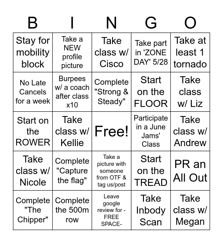 This bingo card has a free space and 24 words: Complete "Capture the flag", Complete the 500m row, Complete "Strong & Steady", Complete "The Chipper", Take at least 1 tornado, Stay for mobility block, No Late Cancels for a week, Take a NEW profile picture, Participate in a June Jams' Class, Take a picture with someone from OTF & tag us/post, Start on the FLOOR, Start on the ROWER, Start on the TREAD, PR an All Out, Burpees w/ a coach after class x10, Take Inbody Scan, Take class w/ Andrew, Take class w/ Cisco, Take class w/ Liz, Take class w/ Kellie, Take class w/ Megan, Take class w/ Nicole, Take part in 'ZONE DAY' 5/28 and Leave google review for -FREE SPACE-.