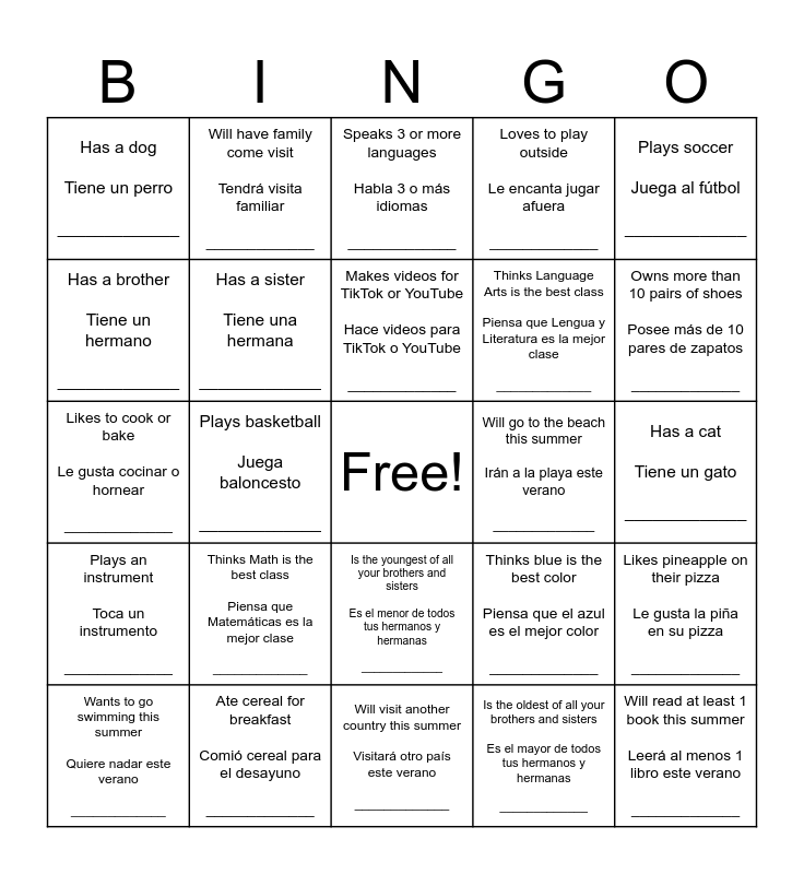This bingo card has a free space and 29 words: Wants to go swimming this summer Quiere nadar este verano _____________, Has broken a bone in the past Se ha roto un hueso en el pasado _____________, Plays basketball Juega baloncesto _____________, Likes to draw Le gusta dibujar _____________, Has a dog Tiene un perro _____________, Speaks 3 or more languages Habla 3 o más idiomas _____________, Has a sister Tiene una hermana _____________, Thinks Math is the best class Piensa que Matemáticas es la mejor clase _____________, Will go to the beach this summer Irán a la playa este verano _____________, Ate cereal for breakfast Comió cereal para el desayuno _____________, Has a cat Tiene un gato _____________, Will read at least 1 book this summer Leerá al menos 1 libro este verano _____________, Will visit another country this summer Visitará otro país este verano _____________, Is the oldest of all your brothers and sisters Es el mayor de todos tus hermanos y hermanas _____________, Owns more than 10 pairs of shoes Posee más de 10 pares de zapatos _____________, Has a pet fish Tiene un pez como mascota _____________, Is the youngest of all your brothers and sisters Es el menor de todos tus hermanos y hermanas _____________, Plays an instrument Toca un instrumento _____________, Plays soccer Juega al fútbol _____________, Likes to cook or bake Le gusta cocinar o hornear _____________, Thinks blue is the best color Piensa que el azul es el mejor color _____________, Will not play Fortnite this summer No jugará a Fortnite este verano _____________, Thinks Language Arts is the best class Piensa que Lengua y Literatura es la mejor clase _____________, Has a brother Tiene un hermano _____________, Loves to play outside Le encanta jugar afuera _____________, Will have family come visit Tendrá visita familiar _____________, Likes pineapple on their pizza Le gusta la piña en su pizza _____________, Makes videos for TikTok or YouTube Hace videos para TikTok o YouTube _____________ and Likes to sleep Le gusta dormir _____________.