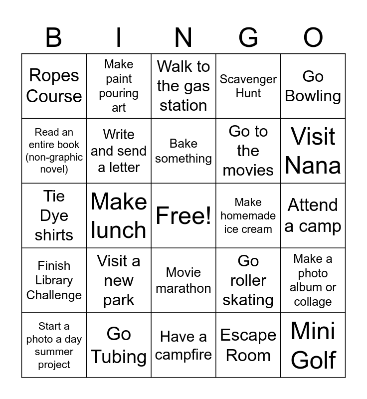 This bingo card has a free space and 38 words: Chalk the driveway, Write a Story, Do a DIY w/recycled item, Write and send a letter, Make a photo album or collage, Visit a new park, Bake something, Make popsicles, Go Bowling, Go to the movies, Make lunch, Scavenger Hunt, Mini Golf, Attend a camp, Read an entire book (non-graphic novel), Finish Library Challenge, Complete Summer Workbook, Walk to the gas station, Learn to play California Speed, Make homemade ice cream, Ropes Course, Go Tubing, Visit Nana, Start a photo a day summer project, Make treats and leave them on a doorstep, Have a campfire, Take a train to another city, Make photo letters, Outdoor movie night, Frisbee Golf, Paint your room, Movie marathon, Escape Room, Make paint pouring art, Homemade Donuts, Go roller skating, Tie Dye shirts and Go on a hike.