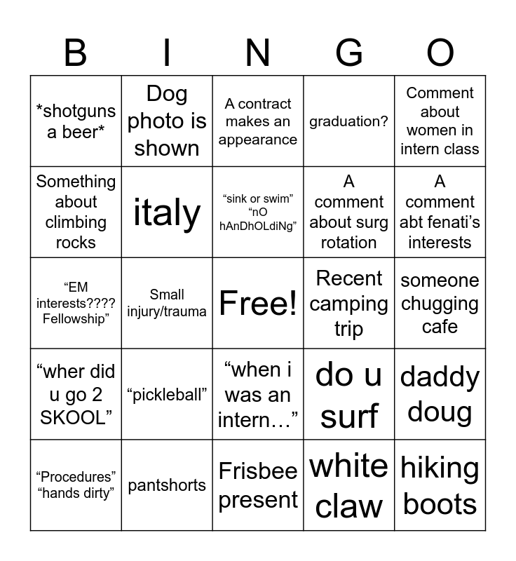 This bingo card has a free space and 25 words: “pickleball”, Frisbee present, “sink or swim” “nO hAnDhOLdiNg”, “Procedures” “hands dirty”, Comment about women in intern class, *shotguns a beer*, Something about climbing rocks, Dog photo is shown, Recent camping trip, “when i was an intern…”, A comment about surg rotation, “EM interests???? Fellowship”, do u surf, daddy doug, italy, “sausage fest”, someone chugging cafe, A contract makes an appearance, A comment abt fenati’s interests, Small injury/trauma, hiking boots, pantshorts, “wher did u go 2 SKOOL”, graduation? and white claw.