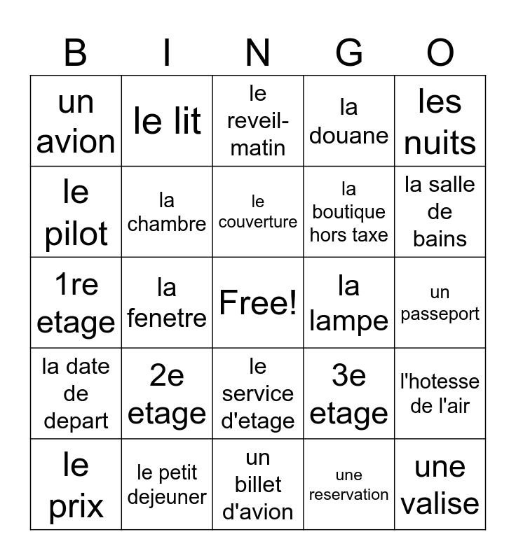 This bingo card has a free space and 34 words: la reception, une reservation, le receptionniste, la date d'arrivee, la date de depart, la chambre, les nuits, le prix, le lit, le matelas, le couverture, le reveil-matin, l'oreiller, une commode, la lampe, la salle de bains, le petit dejeuner, 1re etage, 2e etage, 3e etage, le service d'etage, un aeroport, un avion, un passeport, un billet d'avion, une valise, la douane, l'enregistrement, la boutique hors taxe, le pilot, les sieges, la fenetre, l'hotesse de l'air and l'agent de bord.