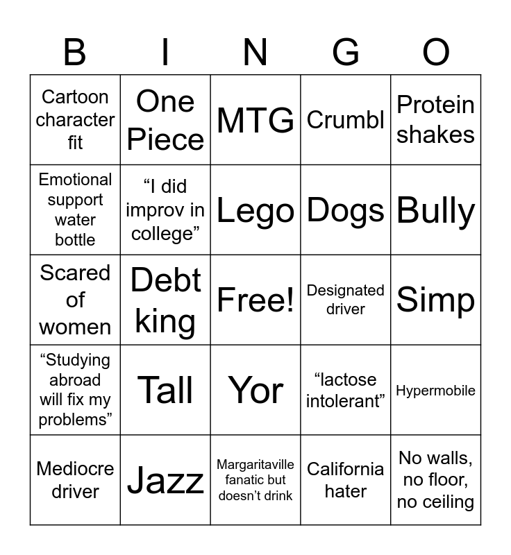 This bingo card has a free space and 24 words: Tall, Jazz, Lego, Mediocre driver, Protein shakes, Cartoon character fit, Emotional support water bottle, One Piece, Designated driver, Yor, Dogs, Scared of women, “lactose intolerant”, Hypermobile, “I did improv in college”, California hater, Simp, MTG, Bully, Debt king, No walls, no floor, no ceiling, “Studying abroad will fix my problems”, Crumbl and Margaritaville fanatic but doesn’t drink.