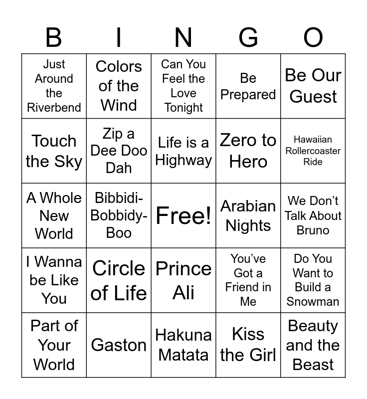 This bingo card has a free space and 44 words: A Friend Like Me, Beauty and the Beast, One Jump Ahead, Part of Your World, I’ll Make a Man Out of You, Kiss the Girl, Can You Feel the Love Tonight, Under the Sea, Be Our Guest, Gaston, Be Prepared, Arabian Nights, Prince Ali, Circle of Life, Bare Necessities, Hakuna Matata, Belle, A Whole New World, I Just Can’t Wait to be King, Hawaiian Rollercoaster Ride, Colors of the Wind, Oo-De-Lally, Siamese Cat Song, Just Around the Riverbend, You’re Welcome, We Don’t Talk About Bruno, Heigh-Ho, Friends on the Other Side, You’ve Got a Friend in Me, I Wanna be Like You, I’ve Got a Dream, Do You Want to Build a Snowman, Down in New Orleans, Whistle While You Work, Bibbidi-Bobbidy-Boo, Mother Knows Best, When Will My Life Begin, Love is an Open Door, Life is a Highway, Touch the Sky, Zero to Hero, Ma Belle Evangeline, Zip a Dee Doo Dah and The Phony King of England.