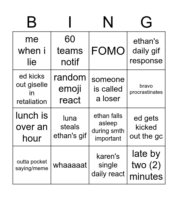 This bingo card has 16 words: whaaaaat, ed gets kicked out the gc, FOMO, me when i lie, lunch is over an hour, 60 teams notif, ethan falls asleep during smth important, karen's single daily react, ed kicks out giselle in retaliation, random emoji react, outta pocket saying/meme, ethan's daily gif response, luna steals ethan's gif, bravo procrastinates, someone is called a loser and late by two (2) minutes.