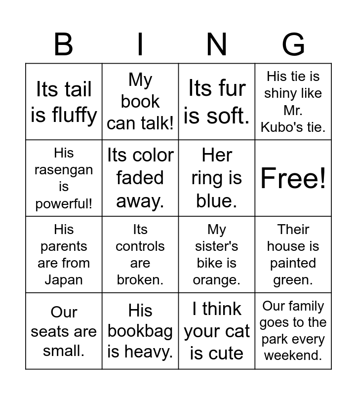 This bingo card has 35 words: My dog is cute., His watch is shiny., Her cup fell on the floor., Her ring is blue., Their phones are too loud!, His tie is shiny like Mr. Kubo's tie., Its color faded away., Our teachers are so cool!, Free!, Their cat is sleeping., My sister's bike is orange., His rasengan is powerful!, Her book is on the shelf., Our school has a big playground, Its tail is fluffy, His bookbag is heavy., Her icecream is melting., Their house is painted green., Our family goes to the park every weekend., Our seats are small., Our school is the best!, Their Mom cooks good meals., My favorite color is blue., Her soccer ball is in her house., Its fur is soft., Its controls are broken., My favorite food is pizza!, Her best friend is from another country., His parents are from Japan, I think your cat is cute, Their family enjoys movie nights togehter., His pencil is yellow., Our classroom has nice desks, My book can talk! and Her friends are nice..