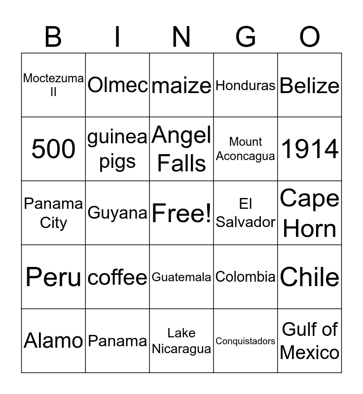 This bingo card has a free space and 44 words: Rio Grande, Gulf of Mexico, Pacific Ocean, Alamo, Spanish, Conquistadors, maize, smallpox, Belize, Panama, Honduras, El Salvador, Guatemala, coffee, illegal drug trade, Lake Nicaragua, Costa RIca, Panama City, France, 1914, Olmec, Aztec, Maya, Moctezuma II, Andes, Cape Horn, Portugese, Brazil, Colombia, Peru, Venezuela, Chile, Bolivia, Simon Bolivar, Guyana, French Guiana, Cayenne, Suriname, Angel Falls, 500, Mount Aconcagua, potatoes, guinea pigs and Cuzca.