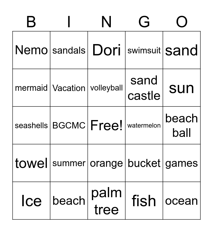 This bingo card has a free space and 29 words: Ice, Lemonade, BGCMC, Shark, Nemo, Dori, Vacation, summer, watermelon, beach, beach ball, ocean, palm tree, fish, sun, sun tan, orange, towel, sand, seashells, bucket, pail, sand castle, mermaid, swimsuit, sandals, games, volleyball and race.