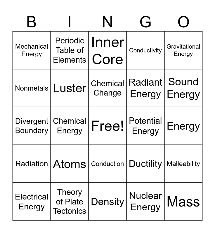 This bingo card has a free space and 46 words: Matter, Mass, Volume, Density, Atoms, Elements, Periodic Table of Elements, Metals, Nonmetals, Metalloids, Luster, Conductivity, Malleability, Ductility, Compounds, Physical Change, Chemical Change, Potential Energy, Kinetic Energy, Gravitational Energy, Chemical Energy, Nuclear Energy, Mechanical Energy, Radiant Energy, Thermal Energy, Sound Energy, Electrical Energy, Convection, Conduction, Radiation, Net Force, Balanced Forces, Unbalanced Forces, Motion, Speed, Theory of Plate Tectonics, Energy, Lithosphere, Mantle, Asthenosphere, Outer Core, Inner Core, Divergent Boundary, Convergent Boundary, Transform Boundary and Mineral.