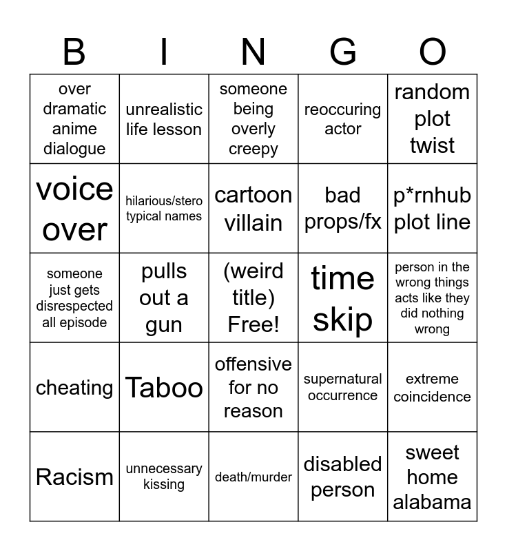 This bingo card has a free space and 24 words: Taboo, unnecessary kissing, cartoon villain, Racism, random plot twist, over dramatic anime dialogue, voice over, unrealistic life lesson, time skip, offensive for no reason, bad props/fx, someone just gets disrespected all episode, supernatural occurrence, extreme coincidence, hilarious/stero typical names, disabled person, person in the wrong things acts like they did nothing wrong, someone being overly creepy, p*rnhub plot line, pulls out a gun, sweet home alabama, cheating, reoccuring actor and death/murder.