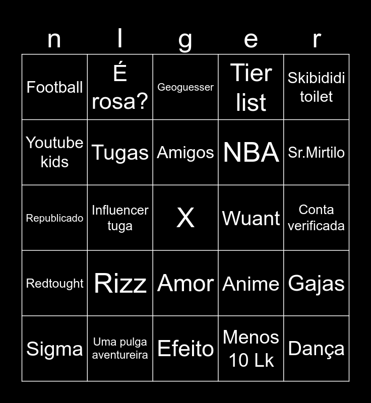 This bingo card has a free space and 24 words: Sigma, Rizz, Amigos, Menos 10 Lk, Skibididi toilet, Football, É rosa?, Geoguesser, Wuant, Conta verificada, Republicado, Tugas, Anime, Gajas, Youtube kids, Uma pulga aventureira, Efeito, Tier list, Sr.Mirtilo, Redtought, Influencer tuga, Amor, NBA and Dança.