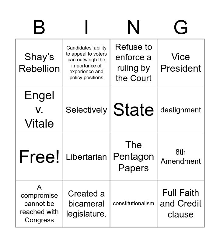 This bingo card has 20 words: 8th Amendment, A state places a tax on furniture that’s made overseas, Refuse to enforce a ruling by the Court, Guidelines issued by government agencies, which provide specific details about how a policy will be implemented, A compromise cannot be reached with Congress, Engel v. Vitale, Created a bicameral legislature., Shay’s Rebellion, Free!, Candidates’ ability to appeal to voters can outweigh the importance of experience and policy positions, Libertarian, The Pentagon Papers, Selectively, Full Faith and Credit clause, State, due process, dealignment, Vice President, constitutionalism and Majority.