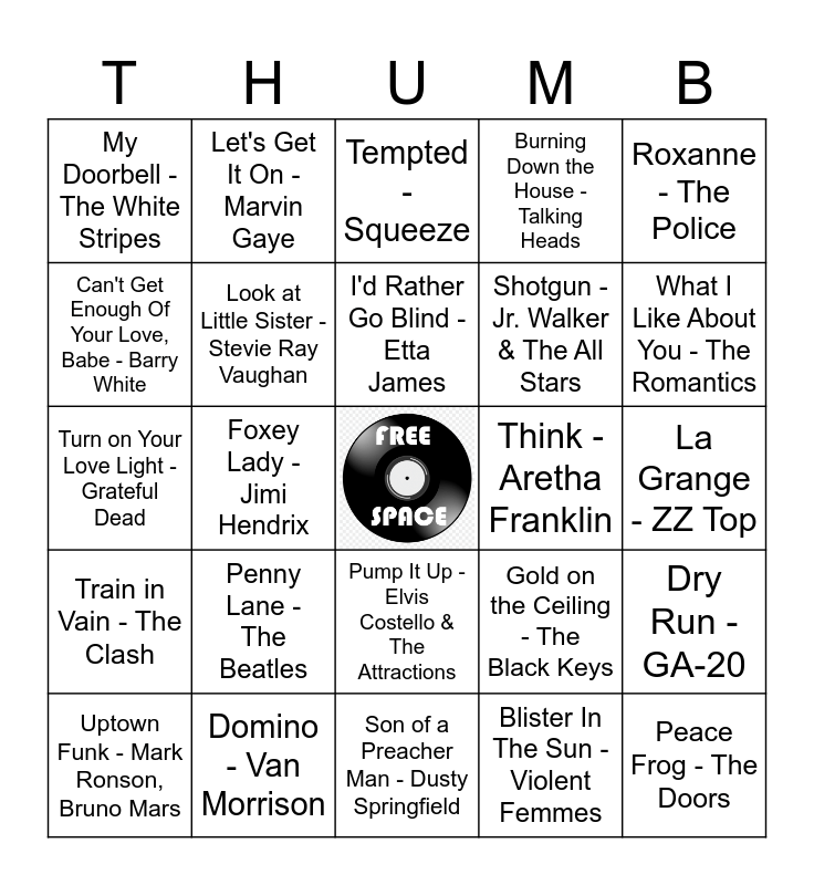 This bingo card has a free space and 48 words: Can't You Hear Me Knocking - The Rolling Stones, Peace Frog - The Doors, Strange Brew - Cream, Son of a Preacher Man - Dusty Springfield, Penny Lane - The Beatles, Ophelia - The Band, Let's Get It On - Marvin Gaye, For Once In My Life - Stevie Wonder, Can't Get Enough Of Your Love, Babe - Barry White, Let's Stay Together - Al Green, Look at Little Sister - Stevie Ray Vaughan, Burning Down the House - Talking Heads, Dry Run - GA-20, Gold on the Ceiling - The Black Keys, Are You Gonna Be My Girl - Jet, Nightclub - Ben Harper, Charlie Musselwhite, I'd Rather Go Blind - Etta James, Think - Aretha Franklin, Proud Mary - Ike & Tina Turner, Roxanne - The Police, Foxey Lady - Jimi Hendrix, Blister In The Sun - Violent Femmes, My Doorbell - The White Stripes, Shotgun - Jr. Walker & The All Stars, Can't Find My Way Home - Blind Faith, What I Like About You - The Romantics, Uptown Funk - Mark Ronson, Bruno Mars, In My Life - The Beatles, Pump It Up - Elvis Costello & The Attractions, Train in Vain - The Clash, Brick House - Commodores, Bell Bottom Blues - Derek & The Dominos, Hey, Hey, What Can I Do - Led Zeppelin, One Way Out - Allman Brothers Band, Domino - Van Morrison, Further on up the Road - The Band, Eric Clapton, Henry The VIII, I Am - Herman's Hermits, La Grange - ZZ Top, Uptown Number 7 - Dion, Brian Setzer, Your Sister Can't Twist - Elton John, Baby I Love You - B.B. King, Bonnie Raitt, Stray Cat Strut - Stray Cats, Tempted - Squeeze, Diamonds on the Soles of Her Shoes - Paul Simon, Turn on Your Love Light - Grateful Dead, Right Next Door - Robert Cray, Higher & Higher - Jackie Wilson and The Tattooed Lady and The Alligator Man - Marcia Ball.