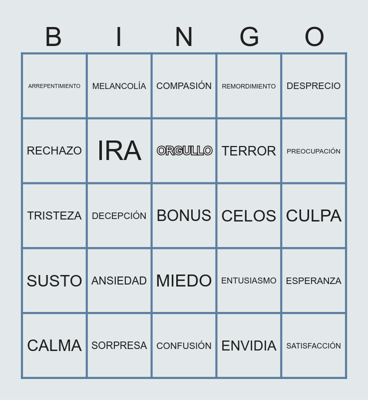 This bingo card has 40 words: ALEGRÍA, TRISTEZA, AMOR, IRA, SORPRESA, MIEDO, ORGULLO, ASCO, DESPRECIO, SUSTO, DECEPCIÓN, REMORDIMIENTO, BONUS, CULPA, CELOS, ANSIEDAD, ORGULLO, ARREPENTIMIENTO, INDIGNACIÓN, COMPASIÓN, ESPERANZA, ENVIDIA, TERROR, RECHAZO, PAVOR, REPUGNANCIA, TEMOR, AVERSIÓN, SATISFACCIÓN, FRUSTRACIÓN, ABURRIMIENTO, CALMA, INDIFERENCIA, ENTUSIASMO, PREOCUPACIÓN, CONFUSIÓN, PREOCUPACIÓN, AGOBIO, MELANCOLÍA and ODIO.