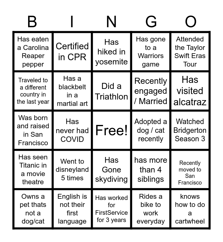 This bingo card has a free space and 24 words: Went to disneyland 5 times, English is not their first language, Did a Triathlon, Owns a pet thats not a dog/cat, Attended the Taylor Swift Eras Tour, Has eaten a Carolina Reaper pepper, Traveled to a different country in the last year, Certified in CPR, Adopted a dog / cat recently, Has Gone skydiving, Recently engaged / Married, Was born and raised in San Francisco, has more than 4 siblings, Recently moved to San Francisco, Has a blackbelt in a martial art, Rides a bike to work everyday, Watched Bridgerton Season 3, Has hiked in yosemite, Has visited alcatraz, Has never had COVID, knows how to do a cartwheel, Has seen Titanic in a movie theatre, Has gone to a Warriors game and Has worked for FirstService for 3 years.