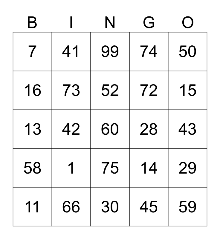 This bingo card has a free space and 24 words: 1, 66, 52, 11, 50, 7, 16, 41, 28, 75, 72, 13, 14, 29, 73, 45, 43, 99, 15, 42, 59, 58, 74 and 30.