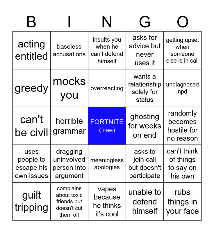 This bingo card has a free space and 24 words: guilt tripping, dragging uninvolved person into argument, overreacting, unable to defend himself, getting upset when someone else is in call, acting entitled, baseless accusations, insults you when he can't defend himself, ghosting for weeks on end, randomly becomes hostile for no reason, can't be civil, mocks you, asks to join call but doesn't participate, can't think of things to say on his own, greedy, complains about toxic friends but doesn't cut them off, vapes because he thinks it's cool, asks for advice but never uses it, undiagnosed npd, uses people to escape his own issues, horrible grammar, meaningless apologies, wants a relationship solely for status and rubs things in your face.