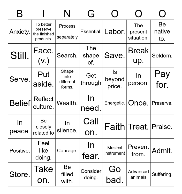 This bingo card has 49 words: Prevent from., Break up., Go bad., Reflect culture., Shape into different forms., Preserve., To better preserve the finished products., Be filled with., The present situation., Call on., Be native to., Essential., In person., Is beyond price., Feel like doing., Once., Still., Seldom., Admit., Labor., Save., Wealth., Anxiety., Face.(v.), Store., Search., Pay for., Take on., Get through, Put aside., Suffering., Energetic., Positive., Courage., Belief, Faith, Treat., Praise., Serve., In silence., In fear., In peace., In need., Consider doing., The shape of., Process …separately, Musical instrument, Be closely related to and Advanced animals.