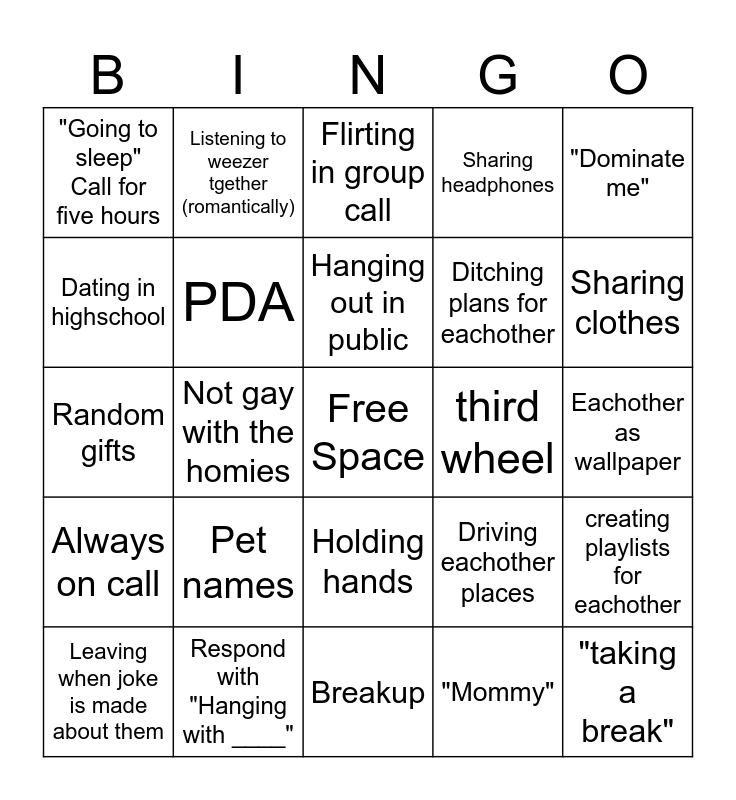 This bingo card has a free space and 29 words: Leaving when joke is made about them, Arguing, Not gay with the homies, Kiss, "Going to sleep" Call for five hours, Flirting in group call, PDA, Pet names, third wheel, Respond with "Hanging with ____", Eachother as wallpaper, "taking a break", Breakup, "Mommy", Sharing clothes, School dance, Holding hands, Always on call, "Dominate me", Random gifts, Driving eachother places, Sharing food, Ditching plans for eachother, Dating in highschool, Sharing headphones, Listening to weezer tgether (romantically), creating playlists for eachother, Hanging out in public and Leaving the friend group.