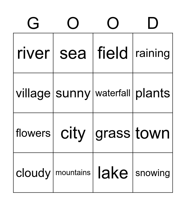 This bingo card has 21 words: mountains, beach, sea, forest, lake, waterfall, river, field, grass, plants, flowers, raining, snowing, windy, sunny, rainbow, cloudy, city, village, town and leaves.