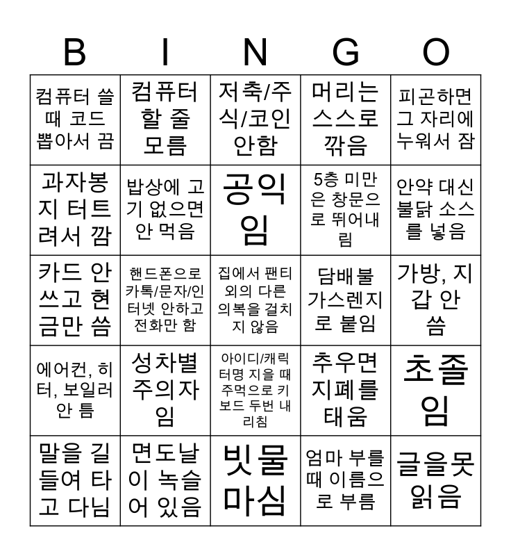 This bingo card has 40 words: 겨울에 찬물, 여름에 끓는 물로 샤워함, 카드 안 쓰고 현금만 씀, 핸드폰은 한번 쓰고 부셔버림, 밥상에 고기 없으면 안 먹음, 면도날이 녹슬어 있음, 아이디/캐릭터명 지을 때 주먹으로 키보드 두번 내리침, 공익임, 머리길이 3cm 이하임, 피곤하면 그 자리에 누워서 잠, 에어컨, 히터, 보일러 안 틈, 핸드폰으로 카톡/문자/인터넷 안하고 전화만 함, 머리는 스스로 깎음, 집에서 팬티 외의 다른 의복을 걸치지 않음, 가방, 지갑 안 씀, 담배불 가스렌지로 붙임, 성차별주의자임, 이름 세글자 이상인 음료 안마심, 컴퓨터 쓸 때 코드 뽑아서 끔, 벽돌 베고 잠, 저축/주식/코인 안함, 초졸임, 엄마 부를 때 이름으로 부름, 5층 미만은 창문으로 뛰어내림, 과자봉지 터트려서 깜, 한쪽 눈을 가로지르는 흉터가 있, 현상금 걸려있음, 바지 안입음, 대리석 덮고 잠, 글을못읽음, 직접 사냥한 고기만 먹음, 출생신고 안돼있음, 말을 길들여 타고 다님, 통화가 끝나면 전화를 부숨, 추우면 지폐를 태움, 안약 대신 불닭 소스를 넣음, 빗물 마심, 가끔 중환자실에서 깨어남, 알에서 태어남, 컴퓨터 할 줄 모름 and 거울을 신기해함.