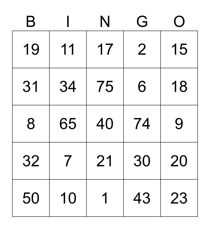This bingo card has a free space and 24 words: 7, 10, 75, 50, 15, 19, 31, 11, 74, 21, 6, 8, 30, 20, 34, 43, 9, 17, 18, 65, 23, 32, 2 and 1.