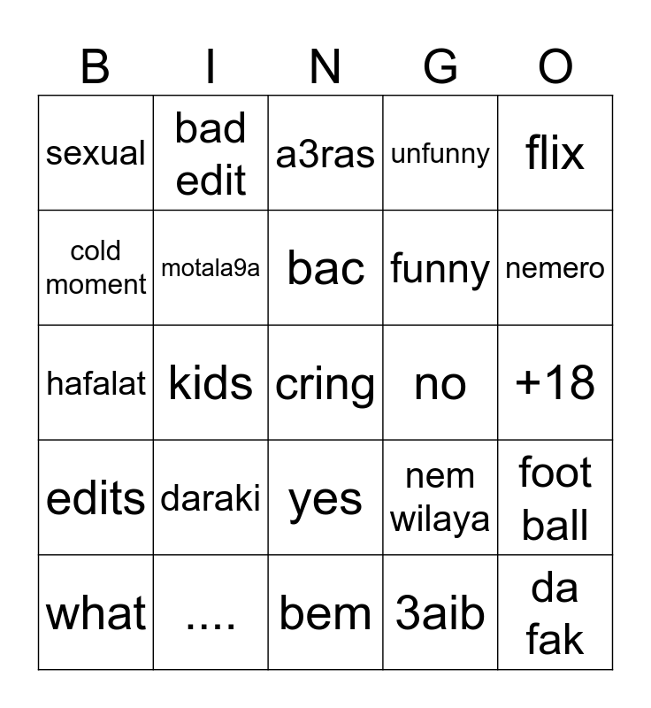 This bingo card has a free space and 24 words: daraki, ...., bac, what, flix, sexual, cold moment, bad edit, no, yes, funny, hafalat, nem wilaya, foot ball, motala9a, 3aib, +18, a3ras, nemero, kids, da fak, edits, unfunny and bem.